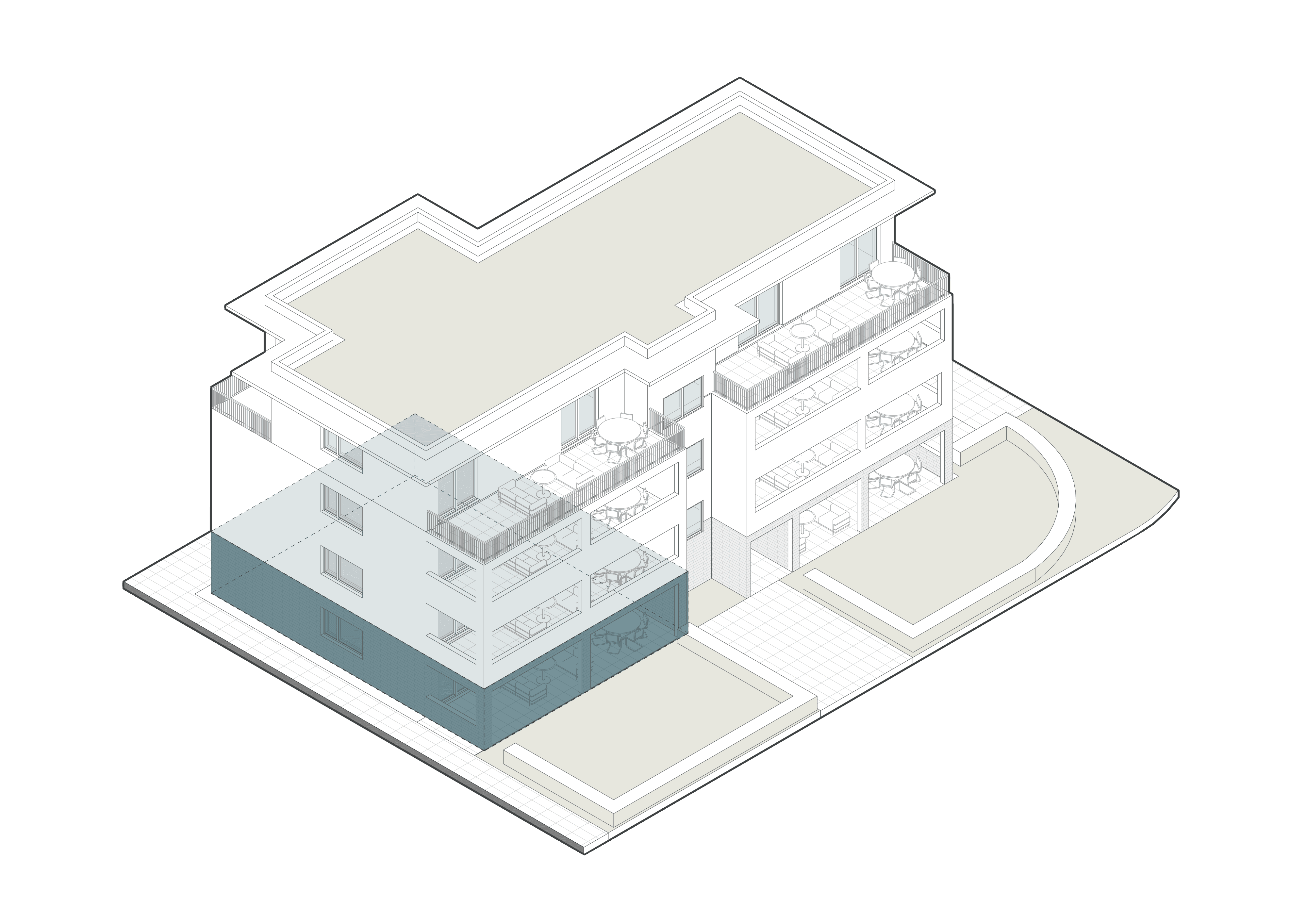 Das Farbkonzept setzt auf helle Fassadenflächen, kombiniert mit dunklen Akzenten im Sockelbereich sowie bei Fenstern, Geländern und Metallelementen. Diese ausgewogene Materialisierung verleiht dem Gebäude eine moderne, wertige Ausstrahlung und unterstreicht den architektonischen Anspruch des Projekts.